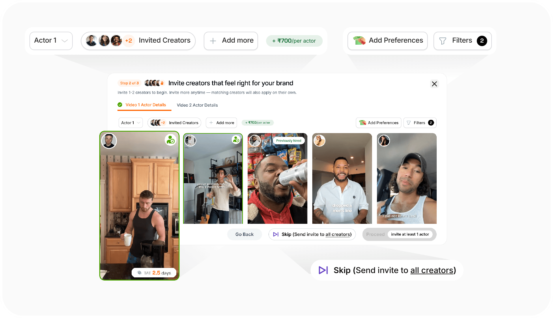 This is the most engaging part of the journey. Clients explore creator profiles, invite one or multiple creators, and even rehire previously worked-with talent. Requiring at least one invite helps us understand intent signals — gender, age, location — allowing smarter matching and attracting relevant creators organically.