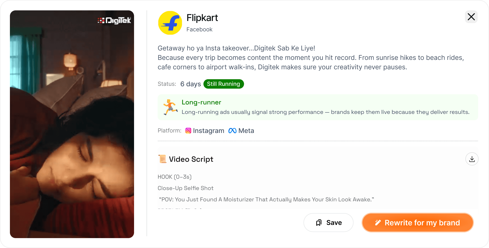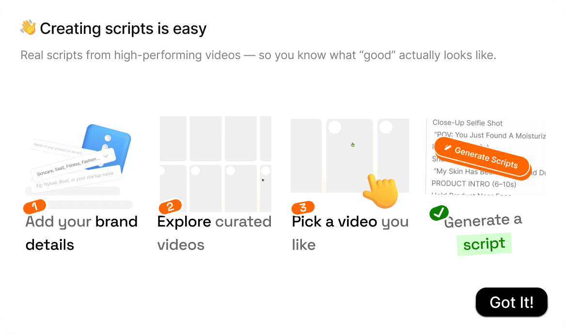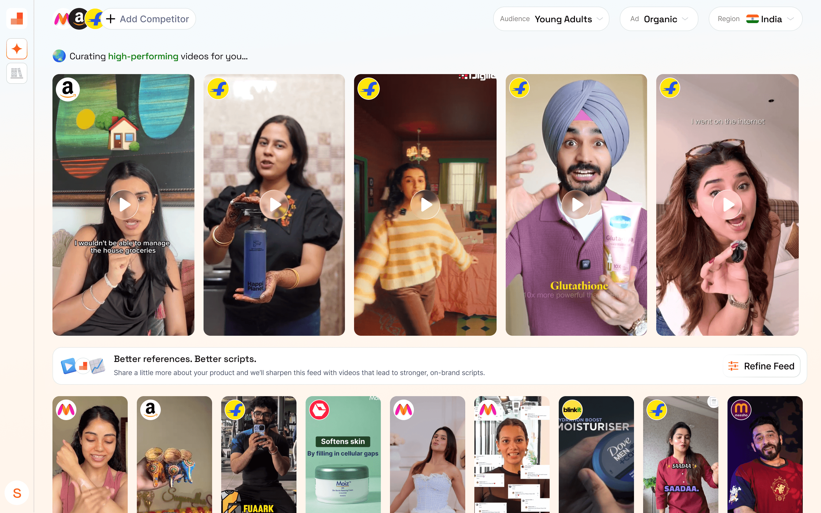 A smart script engine that converts high-performing video inspiration into ready-to-shoot, on-brand scripts.