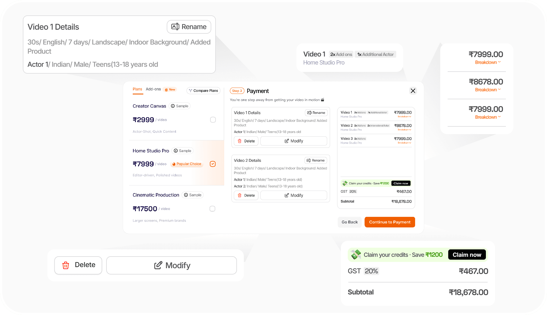 Here intent turns into commitment. Clients review each video, modify plans, remove items, and see a transparent pricing breakdown in real time. We surface available credits here to nudge action, reducing hesitation and rewarding signup while keeping full control in the client’s hands.